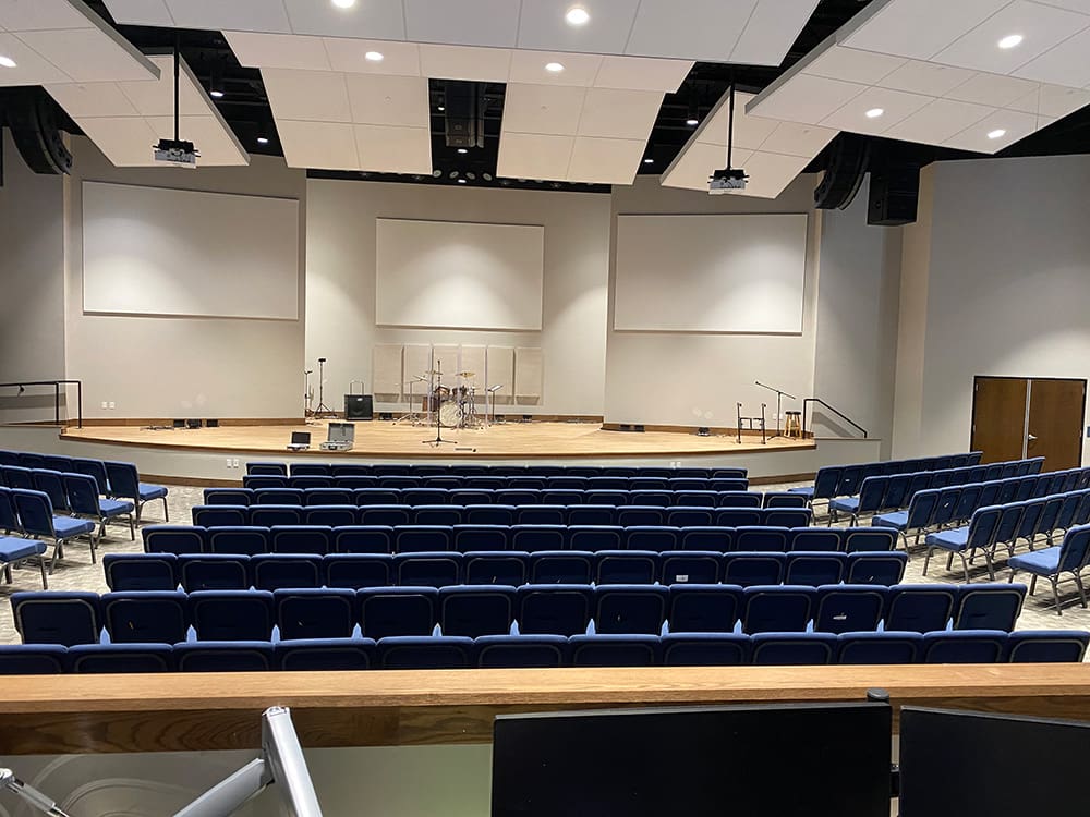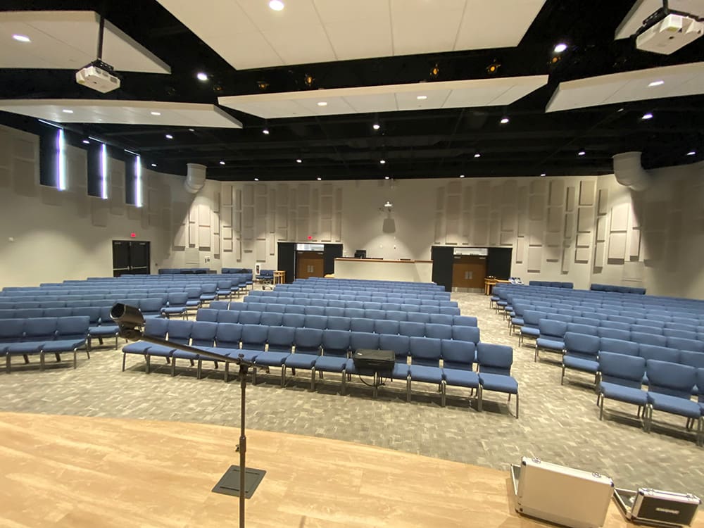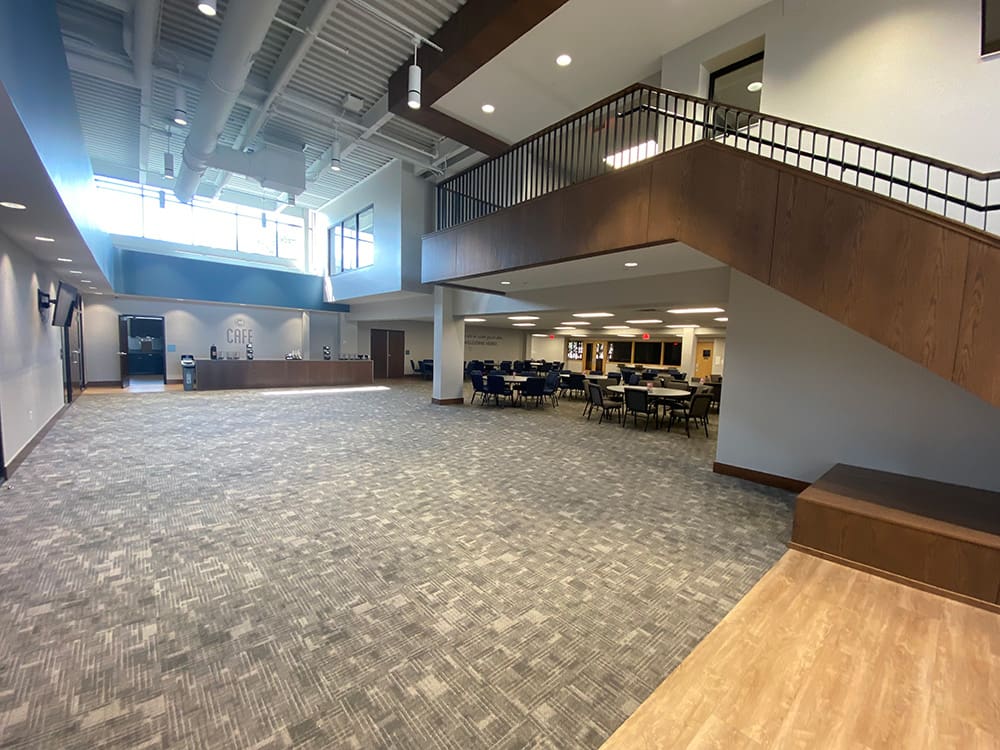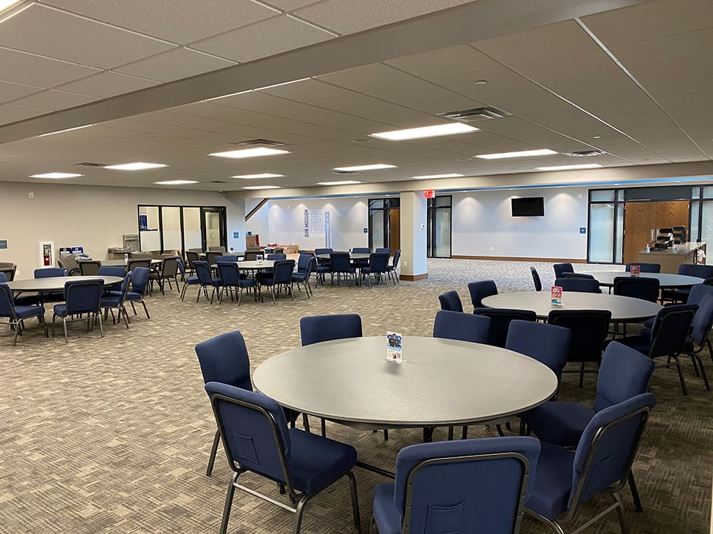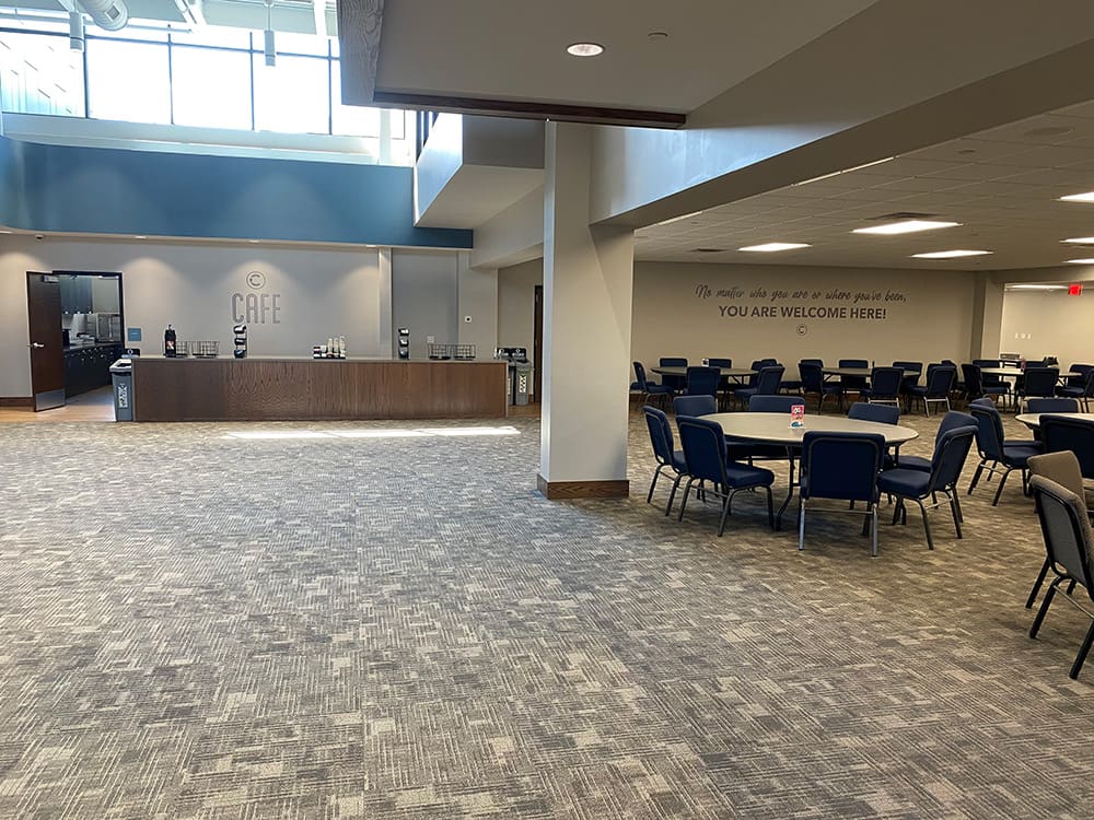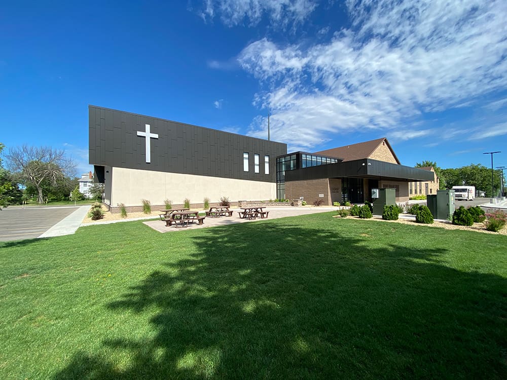 A modern church building, Living Word Lutheran Church, features a cross on its exterior wall, large windows, and a spacious courtyard with picnic tables and a neatly maintained lawn under a blue sky dotted with scattered clouds.