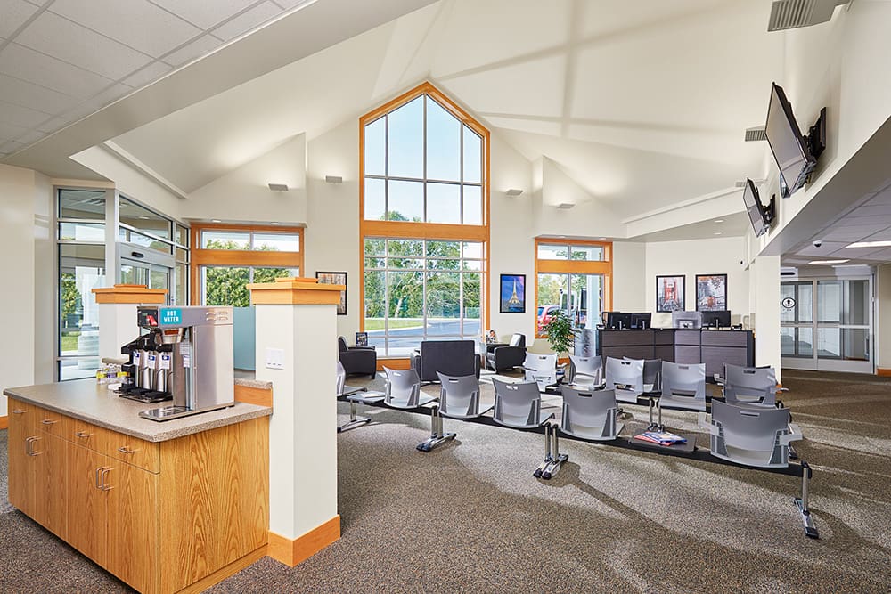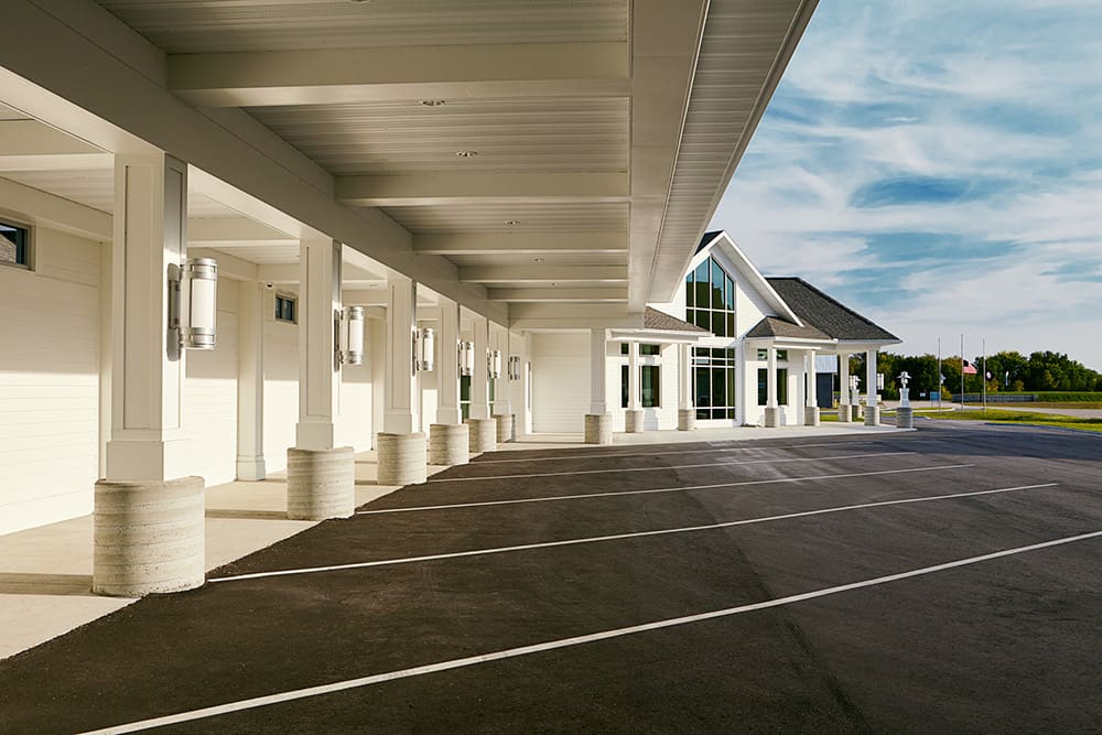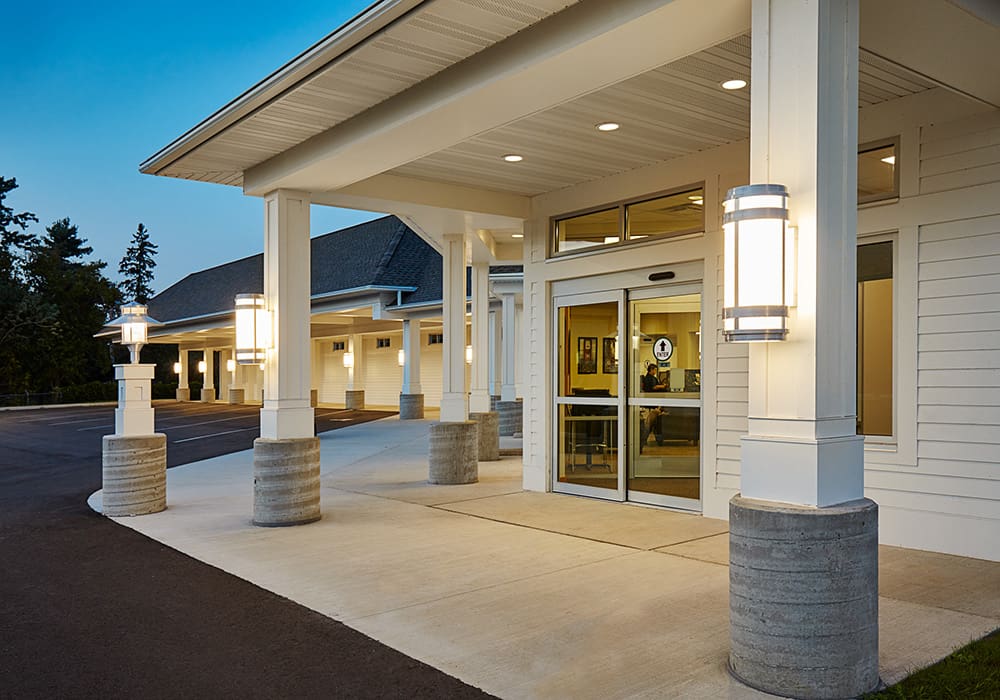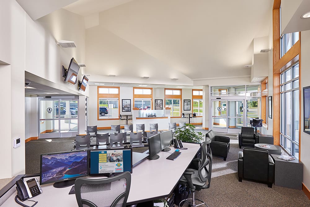 A well-lit building at dusk in Waite Park with large windows and a sign above the entrance that reads "Customer Entrance." The entrance, covered by a white canopy, welcomes guests to Executive Express and is surrounded by a paved driveway and green lawn.