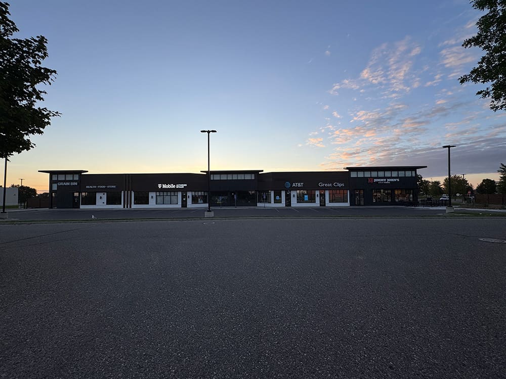 A strip mall with closed stores, including T-Mobile and Grain Bin Health Food Store. The parking lot is empty under a clear early evening sky, with Woody's Car Wash nearby awaiting refacing.