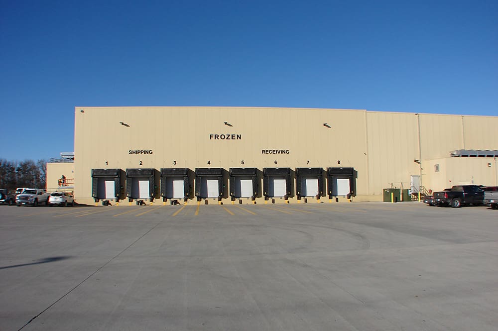 A large beige warehouse belonging to Henry's Foods features multiple loading docks labeled "Frozen," "Shipping," and "Receiving." Several cars and trucks are parked in front under a clear blue sky.