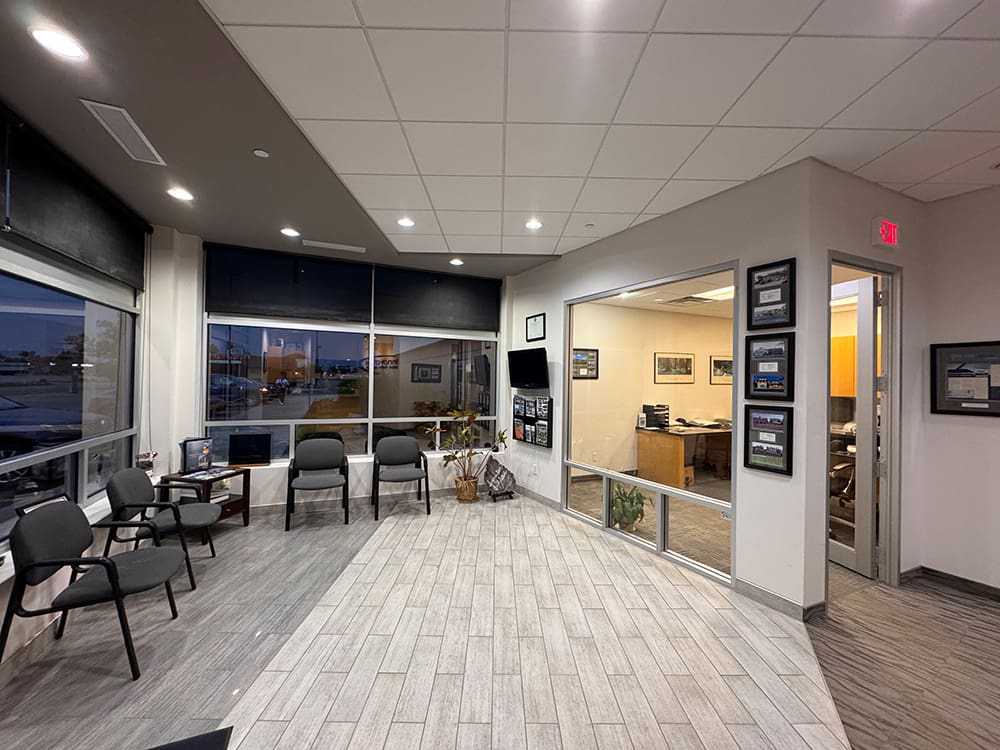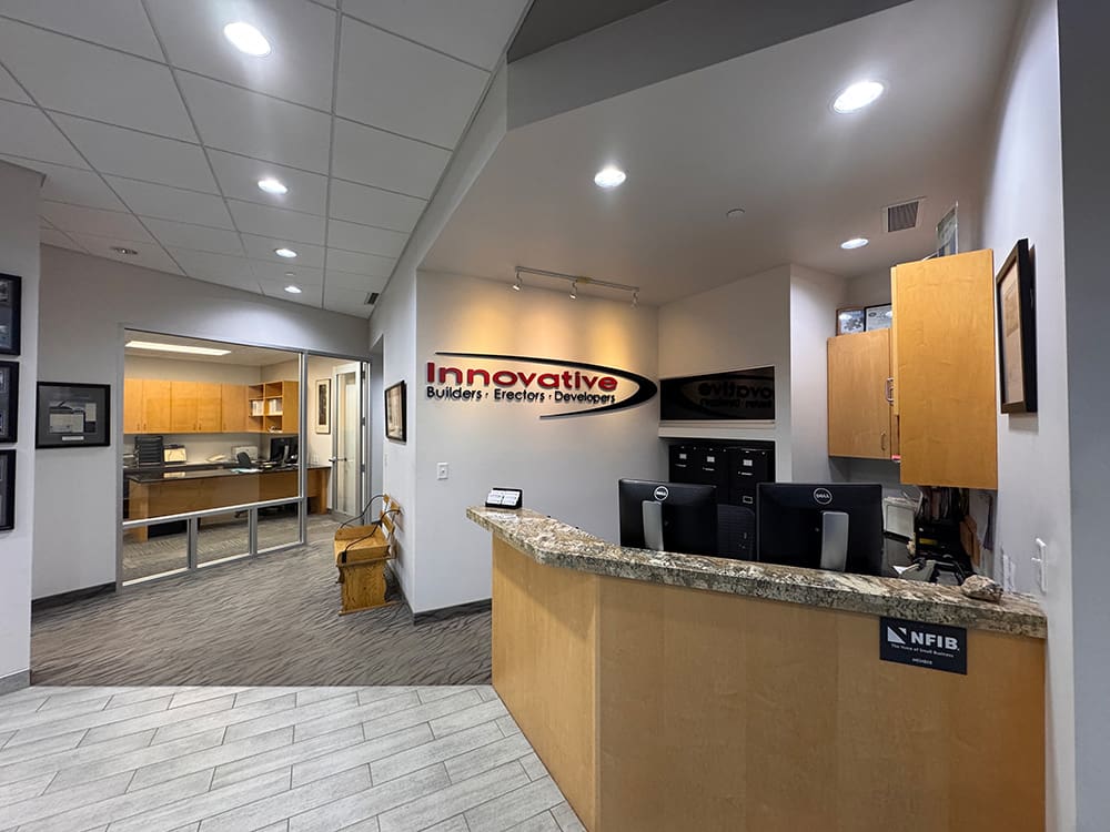 A mostly empty parking lot in front of a one-story commercial building with a sign reading "Innovative Builders" under a partly cloudy sky at sunset.