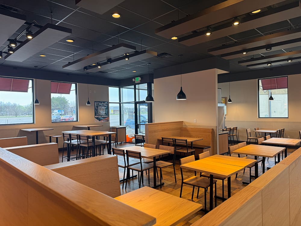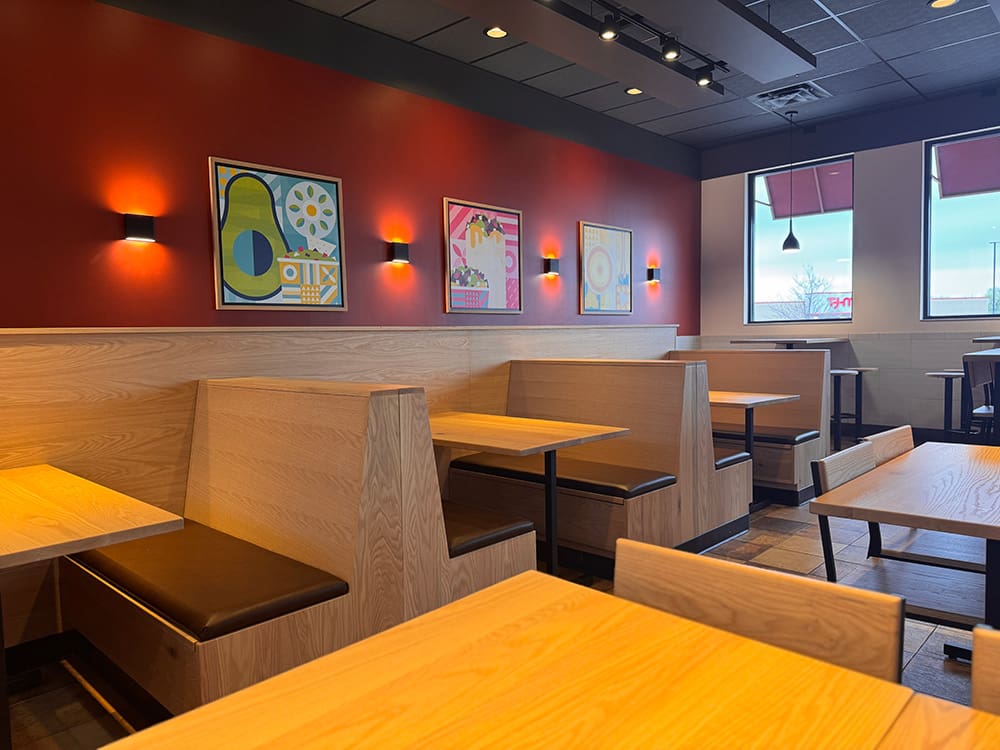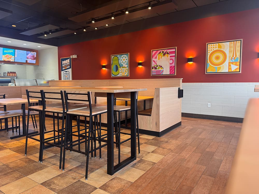 A modern fast-casual restaurant counter with digital Qdoba menu screens, a cash register, food prep area, and a refrigerated display of bottled drinks. Staff members work behind the counter.